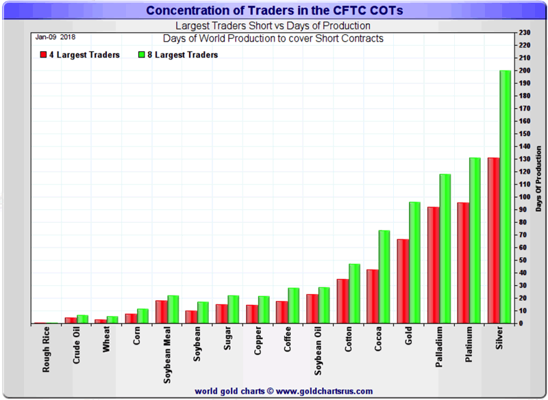 For the current week’s reporting, the four largest traders are short 130 days of world silver production-and the ‘5 through 8’ large traders are short an additional 70 or so days of world silver production-for a total of 200 days. This is around seven months of global silver production.