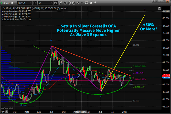 The recent rally in Gold has been substantial and has managed to breach recent resistance levels near $1300~1310. At this point, we are expecting a moderate pullback in Gold over the next few weeks to levels likely near or below the $1300 level before the next leg advances well above $1380. The presumed formation of Wave 3, if our analysis is correct, should prompt a massive move in the metals over the next 3~7 months with a number of pullbacks along the way. Right now, it all depends on how Gold reacts to the recent highs and how deep the next retracement in price is. We could see a $1270~1300 level price pullback before the next leg higher executes. This would be the best entry zone for both traders and long-term investors.