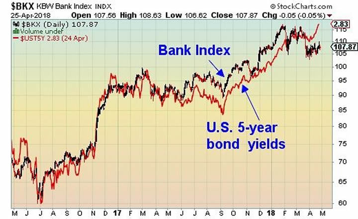 Bottom line: U.S. 5-year Treasury bonds yields move with the U.S. Bank index. Because of this close relationship, investors in the banking sector can gauge the trend of the banks by the yields of 5-year bonds. These key short-term yields tend to lead the banks and can provide a valuable gauge to this sector.