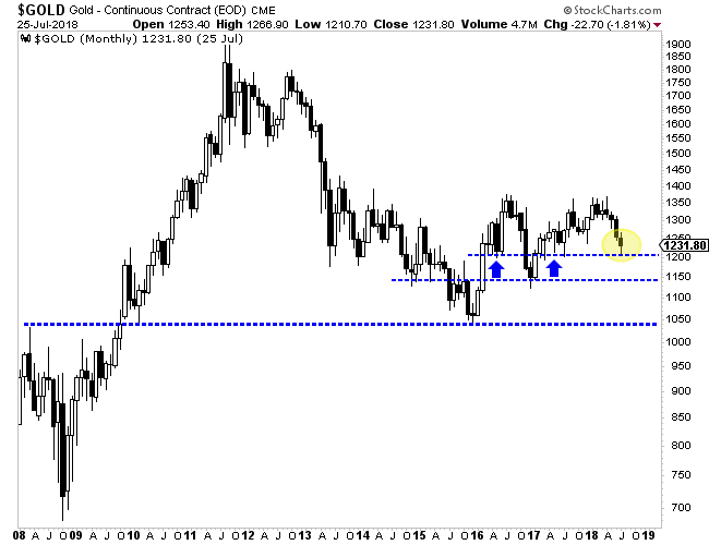 In recent days Gold has bounced from strong monthly support at $1200-$1210/oz. As the chart shows, that level was monthly support in early 2016 as well as the middle of 2017. It is the key support level between Gold and roughly $1140/oz. Look for this support to hold at least into September.