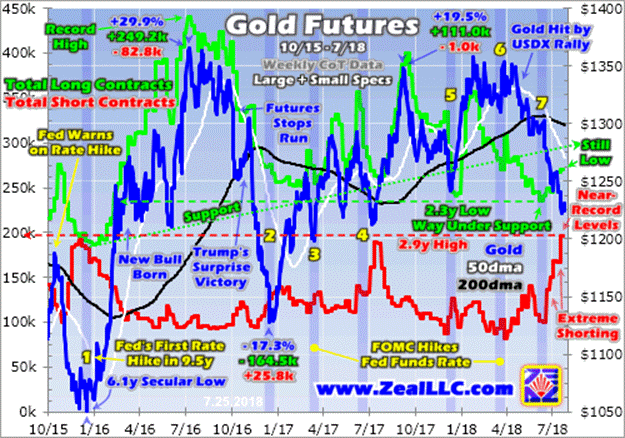 Late every Friday afternoon speculators’ collective gold-futures positions current to preceding Tuesdays’ closes are detailed in the CFTC’s famous Commitments of Traders reports. The latest CoT read when this essay was published is as of Tuesday July 17th. That was actually a couple days before gold’s latest summer-2018 low under $1223 was hit. I was so excited last Friday when I saw speculators’ near-record shorts.