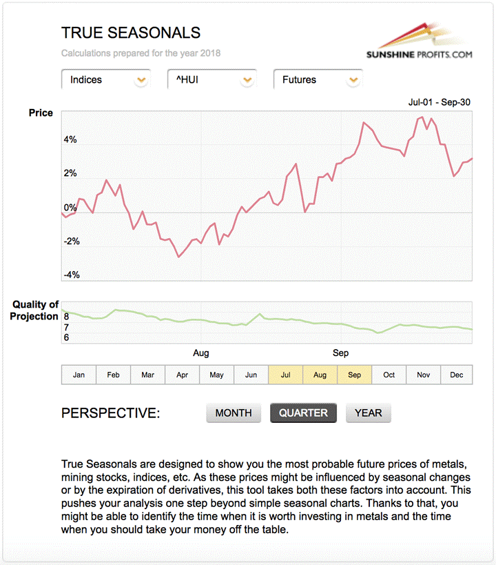 The gold stocks’ seasonality may seem like the thing that one should focus on, but it’s not that simple. For instance, seasonality would have one believe that the HUI index would rally in February this year, especially in its early part. The HUI declined by about 25 index points and the most volatile part of the move took place in the early part of the month. Seasonality and its upgraded form – True Seasonality – are useful tools (particularly for confirming other signals), but are no crystal balls, especially when other strong factors are in place. We are in such a situation right now, so betting on a rally in gold in the coming weeks, just because the yellow metal is currently in the summer doldrums, is not really justified.
