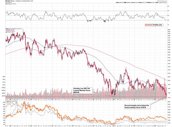 This week is likely to provide us with a decisive move in either direction and the implications are likely to indicate the direction in which platinum will move in the next few weeks, likely taking the rest of the PM sector with it. At the moment of writing these words, the price of platinum is down by $2, while gold is basically flat and silver is up by $0.03. There is a very tiny bearish indication and we should wait for a more significant one before saying that the implications of the above chart are strongly bullish or bearish. At this time, we continue to view them as bearish based on the previous 2 weeks, but not strongly bearish. Consequently, platinum investment doesn’t seem to be really justified, but the outlook for this metal alone, based on the above chart is not yet extremely bad.