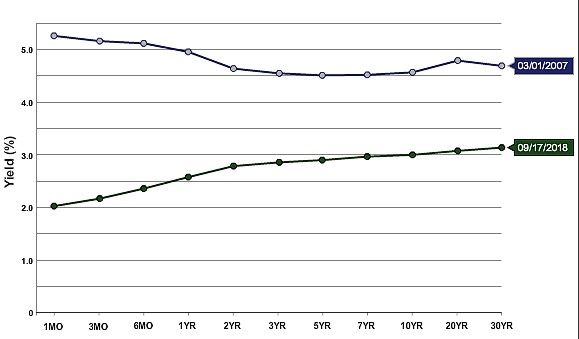 The 2nd lower line is the present US Yield Curve dated September 17, 2018. This is a normal curve and indicates that the Fed has room to raise rates to moderate the growing economy.