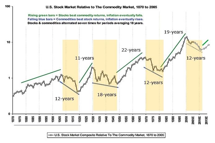 During periods when commodities (CRB) generally outperform stocks (Dow), the corrections in the stock market are usually deeper (40%+), higher probability of inflation over 2%, declining US dollar and shorter business cycles.