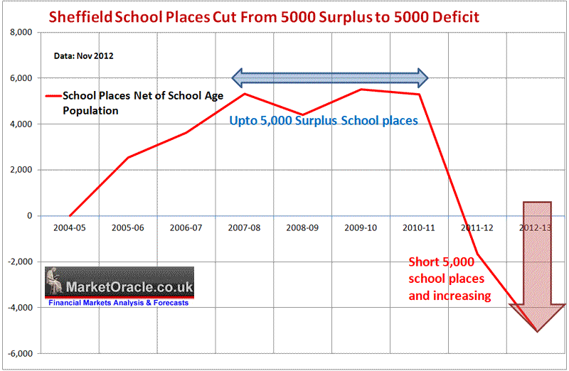 So whilst Sheffield's ruling Labour party councilors will have been publicising the opening of these two new state schools as well as expansion of several existing primary schools across the city that contribute towards the creation of 3000 new school places. However, the whole crisis in school places was self created as I warned would be the inevitable consequences of deep budget cuts in education spending that resulted in school closures and hence the loss of about 5000 school places as the following excerpt from my analysis of Mid 2013 illustrates.