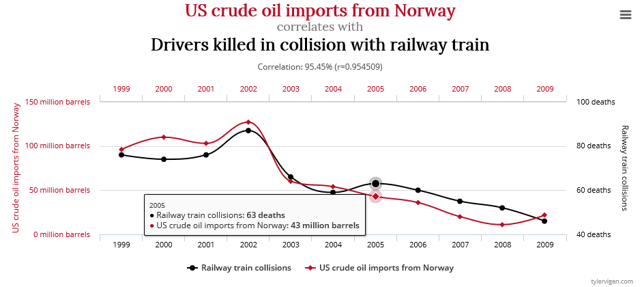 If I were to assume that correlation is akin to causation, then I would conclude that we need to lower the imports of crude oil from Norway even further in order to lower the deaths of drivers killed in collisions with railway trains.