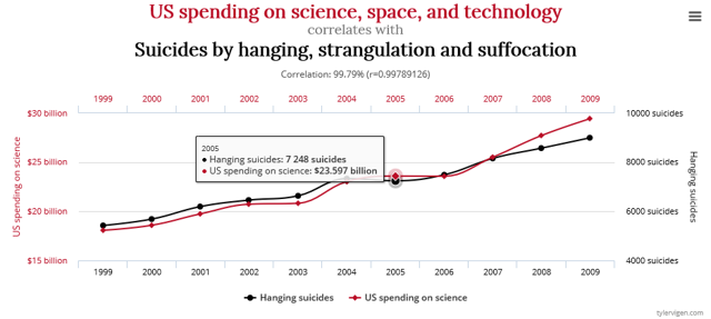If I were to assume that correlation is akin to causation, then I would have to conclude that we need to lower the US spending on science, space and technology in order to lower the number of suicides from hanging, strangulation and suffocation.