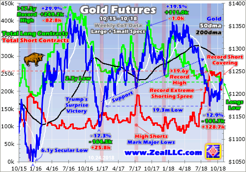 That adds up to 282.0k contracts, equivalent to a colossal 877.1 metric tons of gold! World investment demand in H1’18 totaled just 570.1t for comparison. With the buying fuel for this upleg running around 85% of what drove early 2016’s 30%ish one, this gold upleg should have no problem rallying over 25% from its mid-August lows. That would carry gold to $1467, a major bull breakout above the previous $1365 peak.