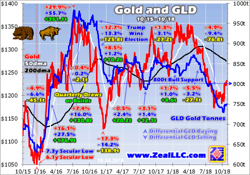Gold tends to rally when stock markets weaken, making it the ultimate portfolio diversifier. Between late April and early October, GLD’s holdings relentlessly dropped 16.2% or 141.0t. GLD’s capital outflows in Q3’18 were the worst by far since Q4’16 when Trump’s surprise election victory really goosed the stock markets and thus hammered gold. By early October, GLD had gone an incredible 2.6 months without any builds!