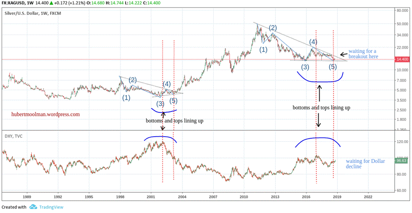 There also other fundamental similarities compared to the same period. The behaviour of the US Dollar index is an important one of them. Below is a comparison of silver and the US Dollar index chart: