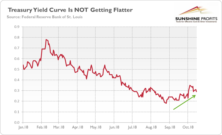 Chart 3: Yield curve (spread between 10-year and 2-year Treasury yields, in %) from January to October 2018.