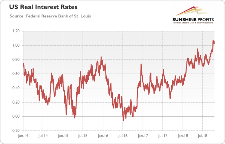 The bottom line is that we could see even higher bond yields in the future. The Fed’s tightening of monetary policy combined with widening fiscal deficits should exert an upward pressure on rates. However, as the US central bank moves relatively slowly, the increase in yields is likely to also be gradual. The higher demand for bonds, in particular from foreign investors (just see what is happening in Italy or in certain emerging markets), should moderate the pressure on bond prices. The gradual rise in yields should not demolish the gold market, but it will not help the yellow metal either. The problem is that nominal yields have been rising not due to inflation, but because of the increase in real interest rates, as one can see in the chart below.
