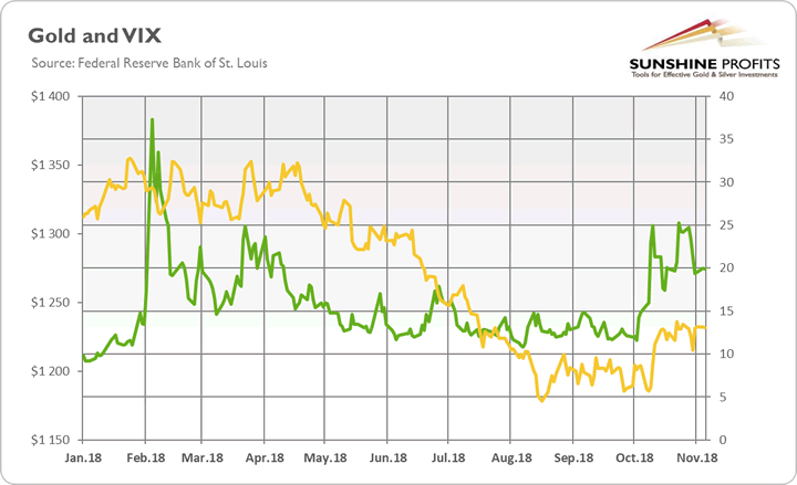 Chart 1: Gold prices (yellow line, left axis) and CBOE VIX index (green line, right axis) in 2018.
