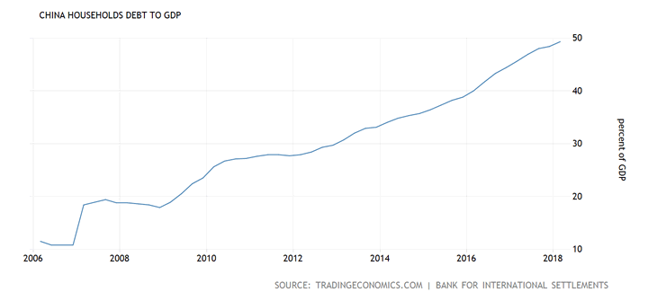 We are more skeptical than Hao. True, the economy is still growing, but that growth is partially possible exactly thanks to incurring more debt. Life on credit is not stable. Especially that, contrary to Hao’s words, Chinese consumers have accumulated a lot of debt recently. Just look at the chart below. As one can see, China’s household debt-to-GDP ratio jumped from almost 40 percent in 2016 to almost 50 percent in the first quarter of 2018, reaching a record high.