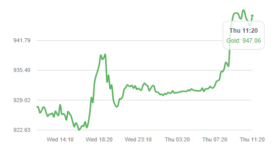The pound has fallen 2.6% against gold in less than twenty four hours seeing gold rise from £923 to £947 per ounce in sterling terms.
