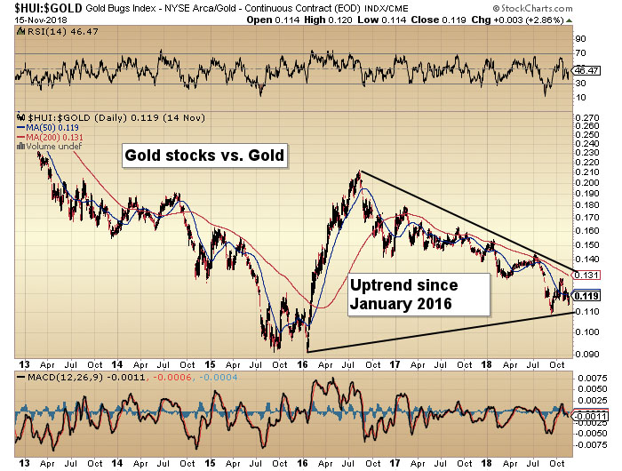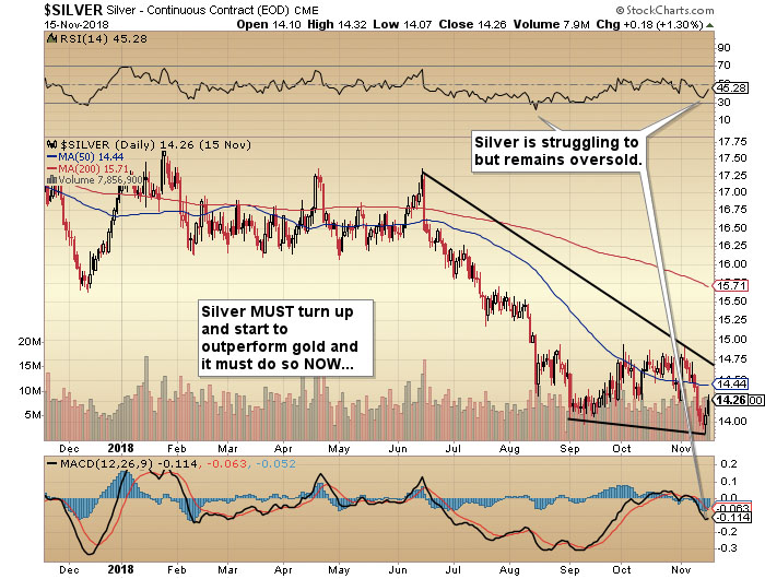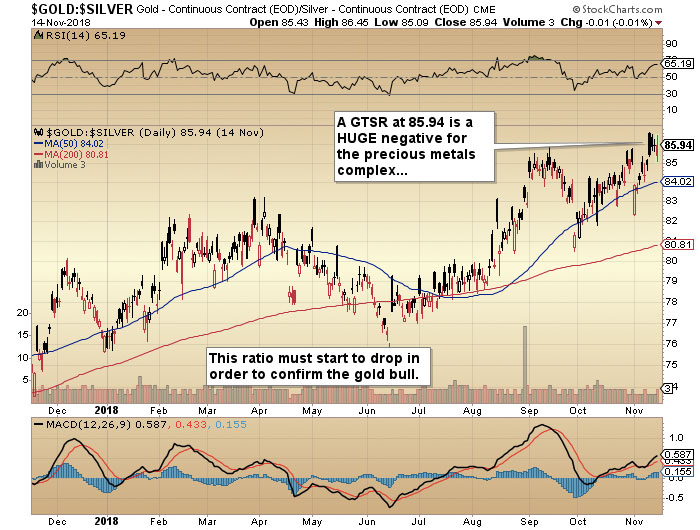 From a purely technical viewpoint, gold prices are trending higher off the $1,167 low on August 16 and while the gold chart looks "OK," the silver chart is dreadful, and as you well know, no up move in gold is sustainable without the participation of silver and in fact its outperformance. Furthermore, the Gold-Stock-to-Gold ratio has been trending lower since September 2017 and only recently reversed. This outperformance by gold miners must continue in order to confirm the uptrend in gold bullion. Conversely, the most glaring non-confirmation for the PM Complex is the horrific action in the Gold-to-Silver-Ratio (GTSR), which today resides at the same level as it was in 1990, 2001, 2008, just before major rallies got underway. I need a solid, three-day close above the $1,235 level, which represents the downtrend line from April peak. If I get that, gold stands a decent chance of reclaiming a "$13 handle" by New Years. However, I need the other related precious metals markets to confirm.