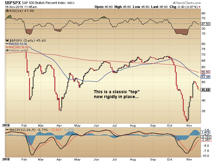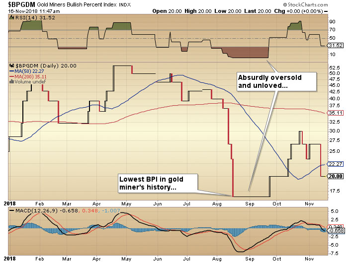 As I look out to the New Year, I am at once both excited and terrified that macro conditions that I have been expecting since 2007 are about to arrive with a venomous vengeance. The vast majority of stocks within the S&P 500 are now in downtrends with many actually mired in bear market territory but the MSM (like CNBC) continues to trot out the cheerleaders in a valiant effort to instill confidence in what has been a debt-fueled orgy of currency debasement and intervention. One looking at the bullish percentage numbers for the S&P 500 for the year and you are immediately hit with a sense of impending doom. Incredibly, the Squawking Heads on CNBC would have us believe that the market is "cheap" after the train wreck that began last February and which has accelerated into Q4 but a bullish percentage number for the S&P at 46 is a yawn compared to 16 for the Gold Miners that prevailed in the summer and which is STILL only at 20. It is a stark reminder of just how devastating the interventions have been to prices and for morale for the space but just how "cheap" the Gold Miners are relative to the S&P.