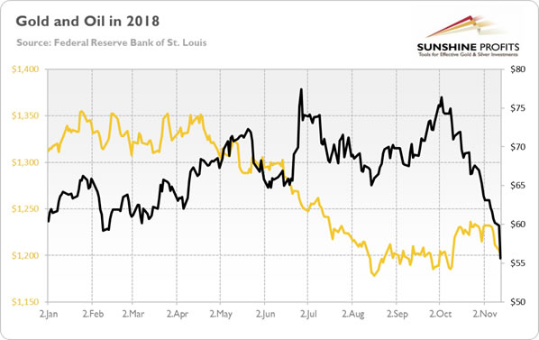 Hence, the conclusion is clear: do not expect higher gold prices due to the surge in inflation or dovish revolution within the FOMC. Actually, given the drop in oil prices and historically strong correlation between oil and gold (see Chart 2), we could rather expect downward moves in the yellow metal later this year.