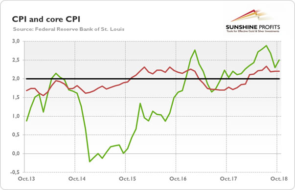 Hence, we claim that the US inflation remains limited and the Fed is not likely to be worried about it. Given the recent pullback in oil prices, inflation is unlikely to rise much further from the current level, at least for now. Therefore, we expect the US central bank to continue its policy of gradually hiking interest rates. Rising rates should support the greenback, which is negative for the gold prices.
