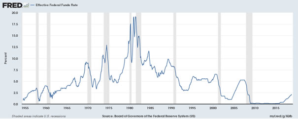 Chart 1: Effective Federal Funds Rate between 1955 and 2018.