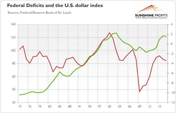 And this is not merely a theoretical possibility the economists model in their ivory towers. Just look at the chart below, which shows the US federal deficits and the trade weighted US dollar index. The correlation is not perfect, but this is because of what really matters for greenback and gold is the fiscal-monetary mix, not the fiscal or monetary policies in separation. So focus on period of 1981-1984, when Reagan-Volcker duo was in charge. The combination of rising deficits and monetary policy tightening made dollar rally, while gold entered its long-term bear market.