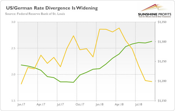 What is really important here is not the mere increase in interest rates, but the upsurge in relation to other economies. The chart below displays the difference between US and German 10-year government bonds. As one can see, the yield gap has widened since the mid-2017.