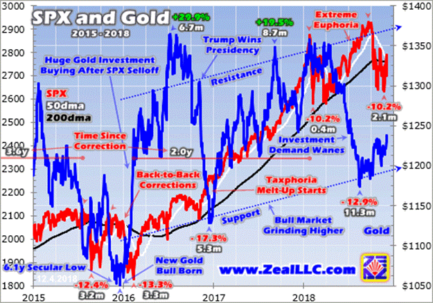 Then the SPX fell into another 13.3% correction over 3.3 months into early 2016. Seeing menacing back-to-back corrections after long years without one really deflated gold-suppressing stock-market euphoria. So in early 2016 American stock investors began prudently rediversifying their stock-dominated portfolios into gold. That birthed today’s gold bull, and the gold-buying momentum fed on itself to drive a powerful upleg.