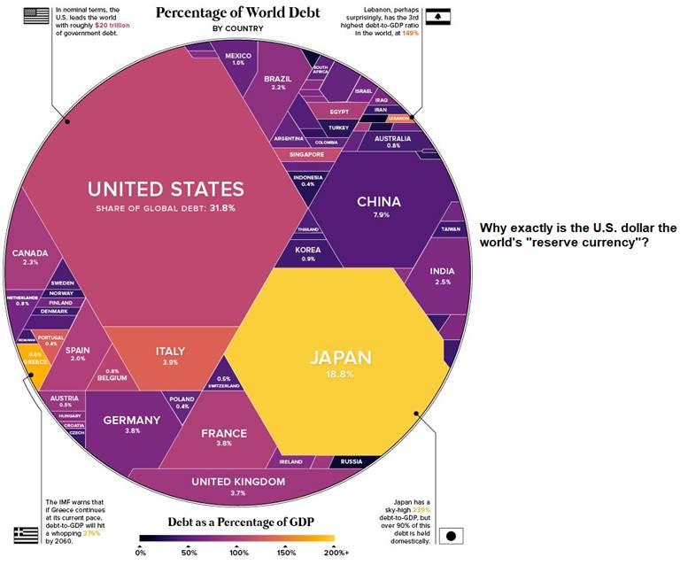 Since the arrival of the New Millennium, we have had the dot.com meltdown, the 9/11 attacks, the Great Financial Crisis (err-fraudulent bailout), and unprecedented credit creation and money-printing, yet gold has never been allowed to resume its rightful place on the throne of fiscal sanity. Many would point to the ascent from $250 per ounce in the late 1990s to $1,920 in August 2011 as the move that would constitute gold's "rightful place" but that is not exactly correct. From the graphic shown below, it makes no common sense whatsoever to believe that the U.S. is better equipped or more likely to repay its gargantuan debt load than China, Japan or Italy.
