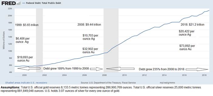 Another graphic that depicts the Ponzi-like status of the U.S. dollar is the total public debt measured against the 8,133.5 metric tonnes of gold and the 25,000 metric tonnes of silver held by the U.S. Treasury.