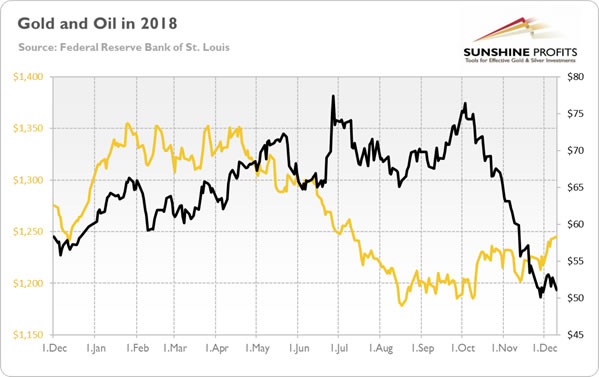 And, indeed, the overall CPI eased, as we predicted. If we did it once, maybe we will do it again – so let’s see what our crystal ball tells us. Hocus pocus, let’s focus! On the chart below, which shows the prices of oil (and gold) since December 2017.