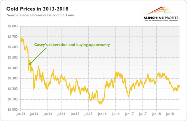 He wrote these words in April, 2013, after the price of gold slid to $1,400 level. Five years later, it is lower, not higher, at the level of about $1,200, as one can see in the chart below. Of course, the price of gold may eventually go higher. But a term “eventually” is not very useful in trading and investments. If the price is going to decline and provide an ultimate buying opportunity at much lower price levels, it simply makes sense to close the positions and reopen them much lower (perhaps profiting from the decline). And you know: Didi and Gogo waited for Godot for a long time, but he never arrived.