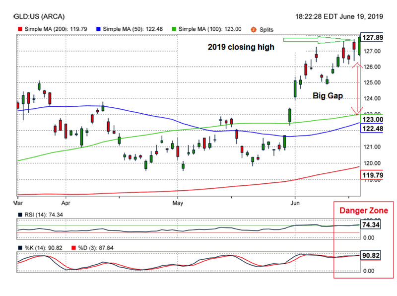 The victims were bond yields (lower) and the U.S. dollar (lower), but the S&P rose 8.71 (0.30%), while gold had at its highest close for 2019 at $1,364.45. The lower U.S. dollar contributed to the advance in the metals, but we are still caught in a resistance quagmire between $1,350 and $1,375, with the relative strength index (RSI) screaming "Overbought!" after an $80 advance.