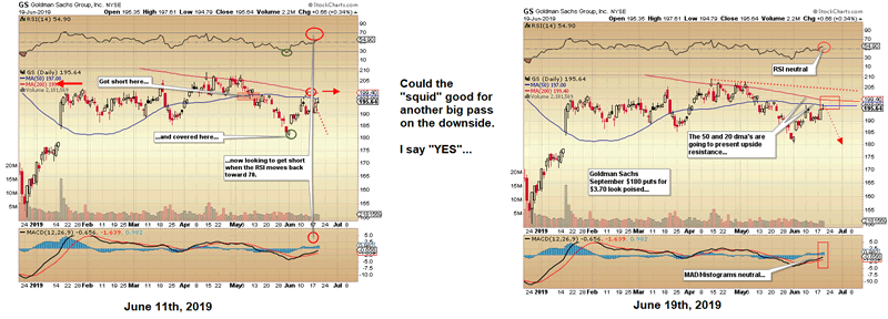 I also went back to our old friend Goldman Sachs and bought the Sept $180 puts for $3.70 in the morning, before the Fed decision was announced. It is noteworthy that the financials all sold off after 2:15, which was not the type of reaction I would have expected with rates remaining unchanged. Higher rates are bullish for banks, as their spreads are currently disastrous given the inversion of the yield curve. The "Squid" is right back to the zone where I got short back in May, and appears ready for another descent. We shall see. . .