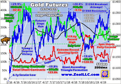 In late January 2018 that vexing upper resistance repelled another valiant gold breakout attempt. Total spec longs crested at 356.4k then. That was 57.3k or 19.2% higher than the latest data. So assuming there wasn’t massive gold-futures long buying leading into this Tuesday, there’s still room for gold-futures speculators to buy another 57k to 141k contracts! Such big long buying would propel gold well higher from here.