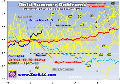 That reveals the center-mass drift trend of gold in market summers, which include June, July, and August proper. Gold’s current 2019 summer action is superimposed over all that history in dark blue. At least as of gold’s $1360 Wednesday close following the FOMC, it was only up 4.2% summer-to-date. That is still within the typical gold summer trend of 5% from May’s close. This gold summer rally is big, but not extreme.