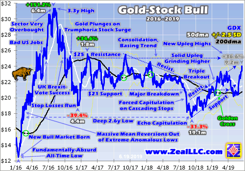 Since late 2016 the gold stocks have been trapped in a giant consolidation by gold remaining mostly out of favor with investors. That manifested in GDX terms in a major trading range running from $21 lower support to $25 upper resistance. On Fed Day as gold rallied to $1360, GDX’s price climbed to $24.00 on close. That was a 16.7-month high for this leading gold-stock benchmark, and nearing its own breakout.