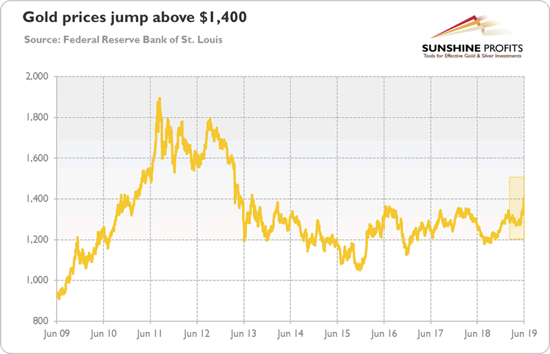 The dovish FOMC meeting was great for the gold prices. As one can see in the chart below, the price of the yellow metal soared above $1,400, to the highest level since 2013.