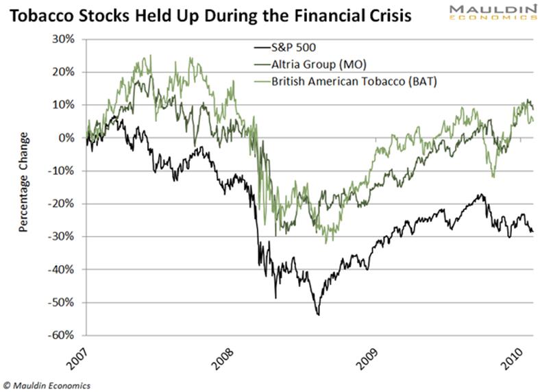 US stocks fell 27% between August 2007 and August 2010. But tobacco stocks held up remarkably well.