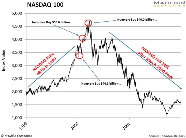 But in January 2000, after the NASDAQ’s 85% run up, investors pushed another $44.5 billion into stocks. And they didn’t stop there.