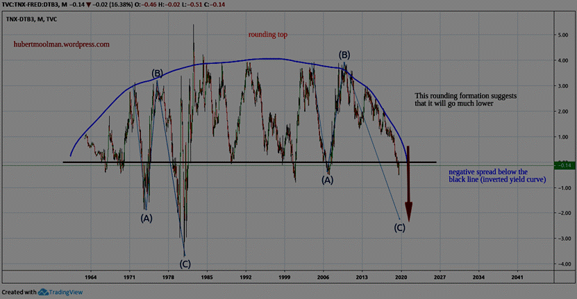 I have chosen these two to show data for a long-term analysis. There appears to be a mega rounding top. The spread has just recently gone negative (inverted). There is a great likelihood that the spread could go lower, given the rounding top and a similarity to the 70s pattern (ABC).