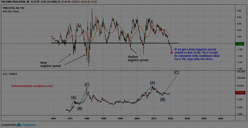 Notice how there were two deep negative spread dives in the 70s. As soon as those spreads went negative the first time during those inversions, silver started a massive rally.