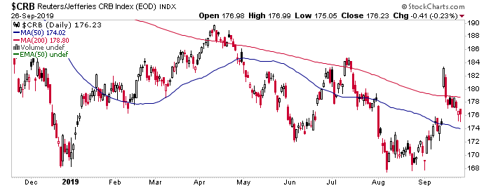 CRB bounced hard, aided by oil’s big spike on the Saudi refinery strike. The moving averages trend down however, so buying commodities was buying into a downtrend. That is usually the stuff of hope and little else.