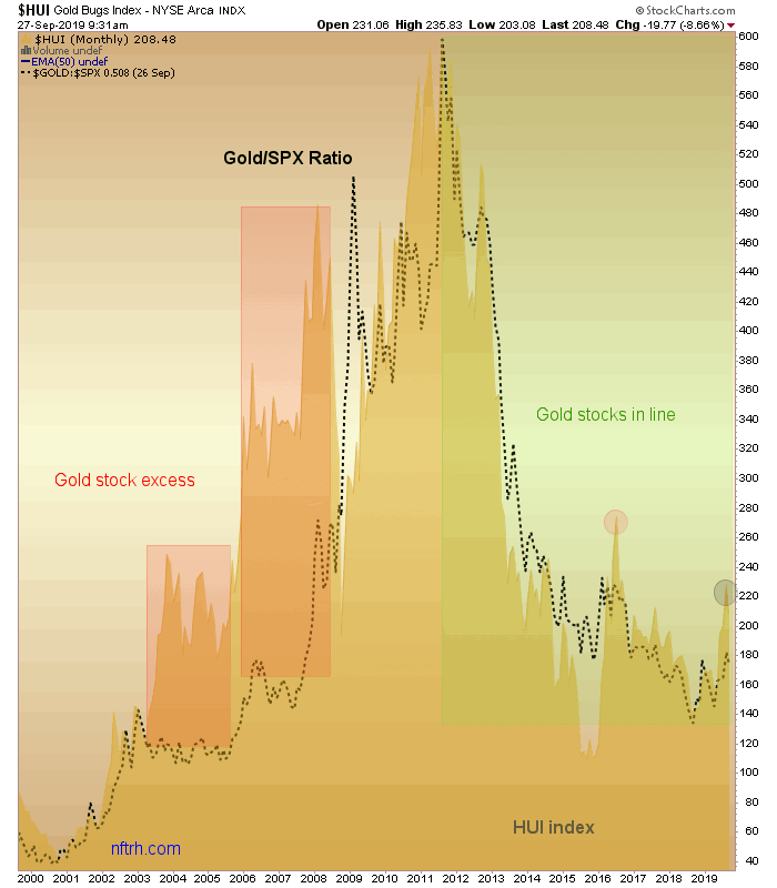 Here is a final chart we’ve been using in NFTRH to gauge how HUI got ahead of itself in relation to another macro indicator, Gold/SPX. The black dot represents a similar condition to the 2016 top. The macro caught a second wind and that was all for the gold miner rally. See again…