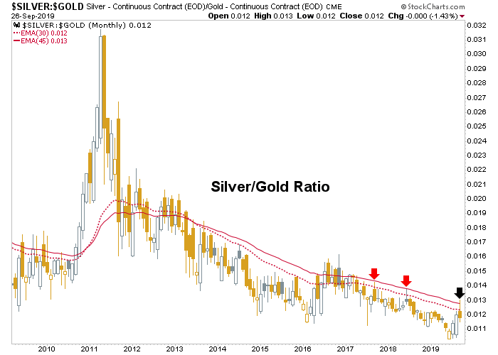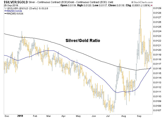 And so here we are, in the midst of a precious metals correction updating not only the key downside supports/targets (each week in NFTRH), but also gauging the interplay of the two precious metals because while this (daily) chart is technically trying to establish a new uptrend in Silver (more relative cyclical commodity characteristics) vs. Gold (more relative counter-cyclical, non-commodity characteristics)…