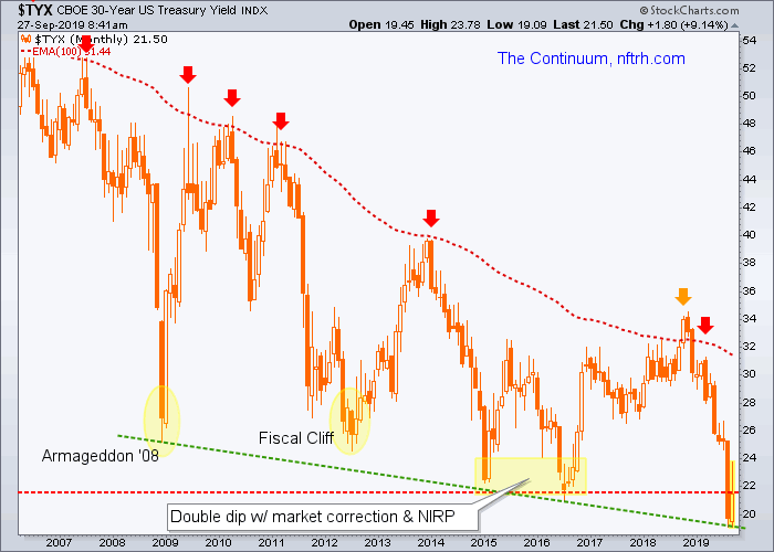 The first and more recent post noted that the 30yr yield needs to climb above 2.2% to even think of hinting toward a temporary inflation trade. The chart from that post shows that while the Continuum is of a long, deflationary structure the periodic pings upward to the (monthly EMA 100) limiter often represent times of cyclical inflationary bursts. This morning the 30 year yield stands at 2.15%.