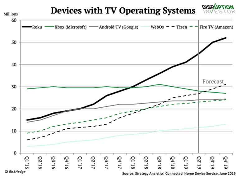 Roku is now in tens of millions of TVs, and that number is growing. And while its user base is one-fifth of Netflix’s, its daily average watch-time per user beats Netflix’s by 3X.