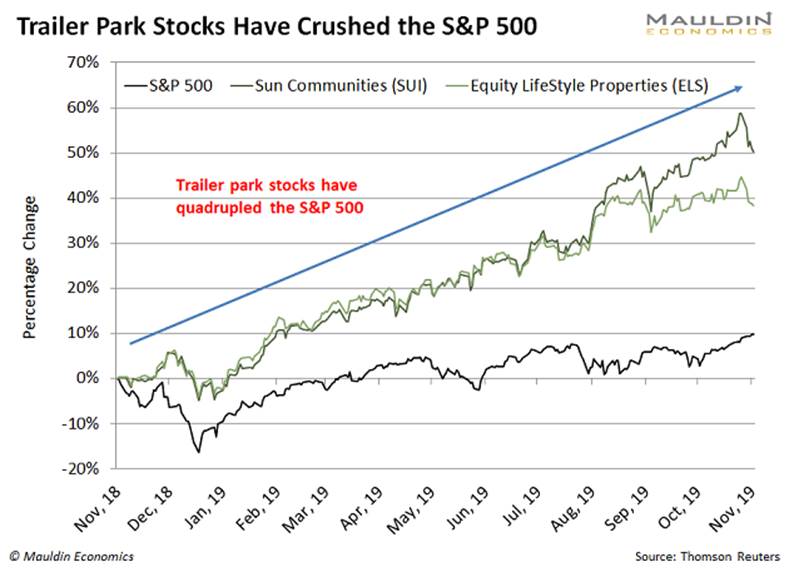 Last November, we talked about investing in two manufactured home REITs: Sun Communities (SUI) and Equity LifeStyle Properties (ELS). Since then, they’ve surged 53% and 42%, respectively. (The S&P 500 has risen 12.3% over the same period.)