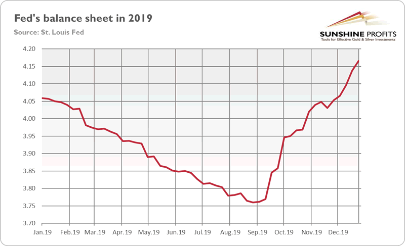 Please look at the chart below. It shows the Fed’s balance sheet in 2019. Although the U.S. central bank has managed to shrink its assets a bit compared to the peak of $4.516 trillion from early 2015, the quantitative tightening has ended quickly.