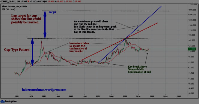 Nevertheless, those who now take the enormous stock market profits by selling out, and buying silver, will be the big winners, especially if they can ride it up close to the target of the cup-and-handle pattern.